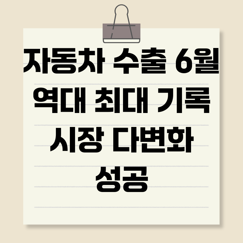 자동차 수출, 6월 역대 최대! 시장 다변화 성공 비결은?2024년 6월, 대한민국 자동차 수출이 역대 최고 기록을 경신했습니다. 단순한 숫자 놀음을 넘어, 이는 우리 자동차 산업의 경쟁력 강화와 시장 다변화 노력이 결실을 맺고 있음을 보여주는 중요한 지표입니다. 하지만 과연 이러한 성장의 배경에는 무엇이 있을까요? 그리고 앞으로 우리는 어떤 전략을 통해 지속적인 성장을 이어나갈 수 있을까요? 지금부터 자동차 수출의 빛나는 성과와 그 이면에 숨겨진 이야기를 심층적으로 분석해 보겠습니다.6월 자동차 수출, 역대 최고 기록 달성!최근 발표된 자료에 따르면, 2024년 6월 자동차 수출액은 59억 달러를 넘어섰습니다. 이는 종전 최고 기록을 훨씬 뛰어넘는 수치이며, 우리 자동차 산업의 위상을 다시 한번 드높이..