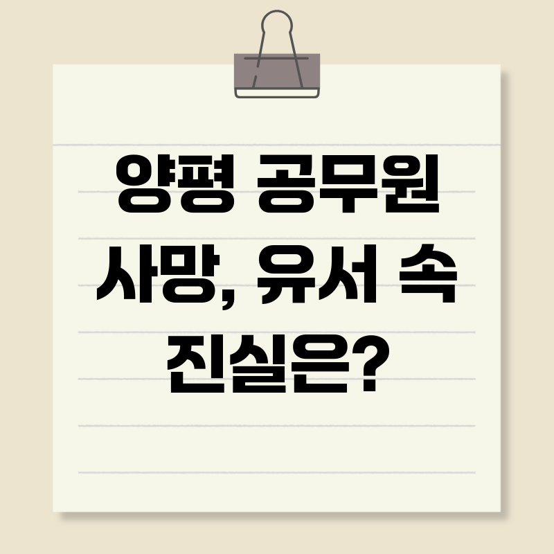 양평 공무원 사망 미스터리: 특검 수사, 진실은 침묵 속에?최근 양평군 공무원의 안타까운 사망 소식이 전해지면서 사회적으로 큰 파장이 일고 있습니다. 특히 고인이 남긴 유서에는 특검 수사에 대한 압박감을 토로하는 내용이 담겨 있어 논란은 더욱 거세지고 있습니다. 이번 사건은 단순히 한 개인의 비극을 넘어, 공익을 위한 수사 과정에서 발생할 수 있는 인권 침해 문제, 그리고 권력형 비리 수사의 민낯을 드러내는 것은 아닌지 심각한 우려를 낳고 있습니다. 과연 진실은 무엇일까요? 그리고 우리는 이 사건을 통해 무엇을 깨달아야 할까요?사건의 개요: 양평 공무원 사망과 엇갈린 주장사건은 김건희 여사 일가의 '양평 공흥지구 개발 특혜 의혹'을 수사하던 민중기 특별검사팀의 조사 이후 발생했습니다. 숨진 A씨는 양평군..