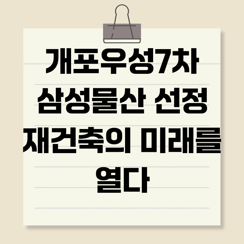 개포우성7차 재건축, 삼성물산 선택! 미래는?강남 재건축 시장의 뜨거운 감자, 개포우성7차 아파트 재건축 사업의 시공사로 삼성물산이 선정되었습니다. 단순한 시공사 선정을 넘어, 이번 결정은 강남 재건축 시장의 판도를 바꿀 중요한 변곡점이 될 수 있습니다. 왜냐하면, 삼성물산이라는 브랜드가 가지는 상징성, 그리고 앞으로 개포우성7차가 보여줄 미래는 단순한 주거 공간을 넘어 '새로운 랜드마크'로서의 가능성을 제시하기 때문입니다. 과연 삼성물산은 개포우성7차를 어떻게 변화시킬 것이며, 우리는 이 변화를 통해 어떤 미래를 그려볼 수 있을까요?개포우성7차 재건축, 왜 주목해야 할까?개포우성7차 아파트 재건축은 단순히 낡은 아파트를 허물고 새 아파트를 짓는 사업이 아닙니다. 이 프로젝트는 강남이라는 대한민국 부동산..